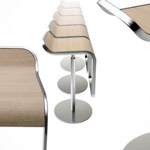 Poltrona lounge com concha de contraplacado folheado a freixo, estrutura e braços de madeira maciça de freixo. Poltrona lounge com encosto alto, concha estofada, estrutura e braços de madeira maciça de freixo. Banco de bar com concha de couro genuíno, estrutura de madeira maciça de freixo e apoio para os pés em aço inoxidável. Banco de bar com concha de contraplacado folheado a freixo, estrutura de madeira maciça de freixo e apoio para os pés em aço inoxidável.